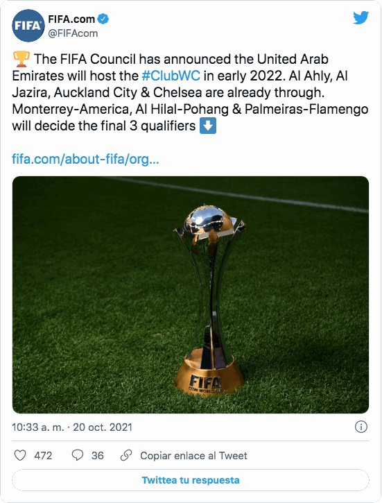 "El Mundial de Clubes (de 2021) se jugará a principios de 2022. No hay unas fechas precisas, pero el anfitrión será Emiratos Árabes Unidos", dijo Infantino en una conferencia de prensa tras una reunión del Consejo de la FIFA.