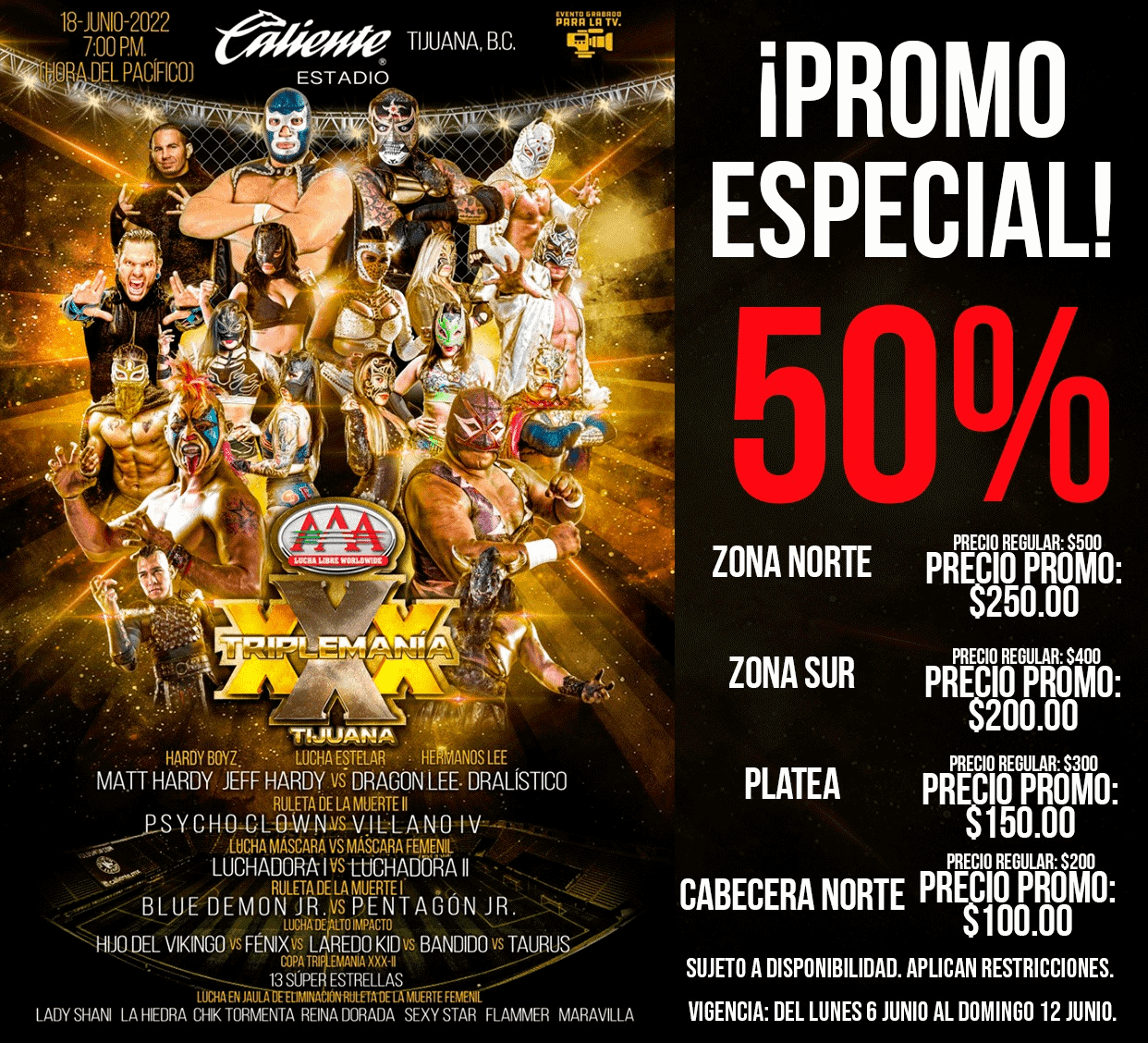 TIJUANA- La empresa AAA Lucha Libre Worldwide dio a conocer que habrá descuentos en las entradas durante la semana del 6 al 12 de junio para el evento Triplemanía XXX, que se llevará a cabo en el estadio Caliente de Tijuana el próximo 18 de junio.