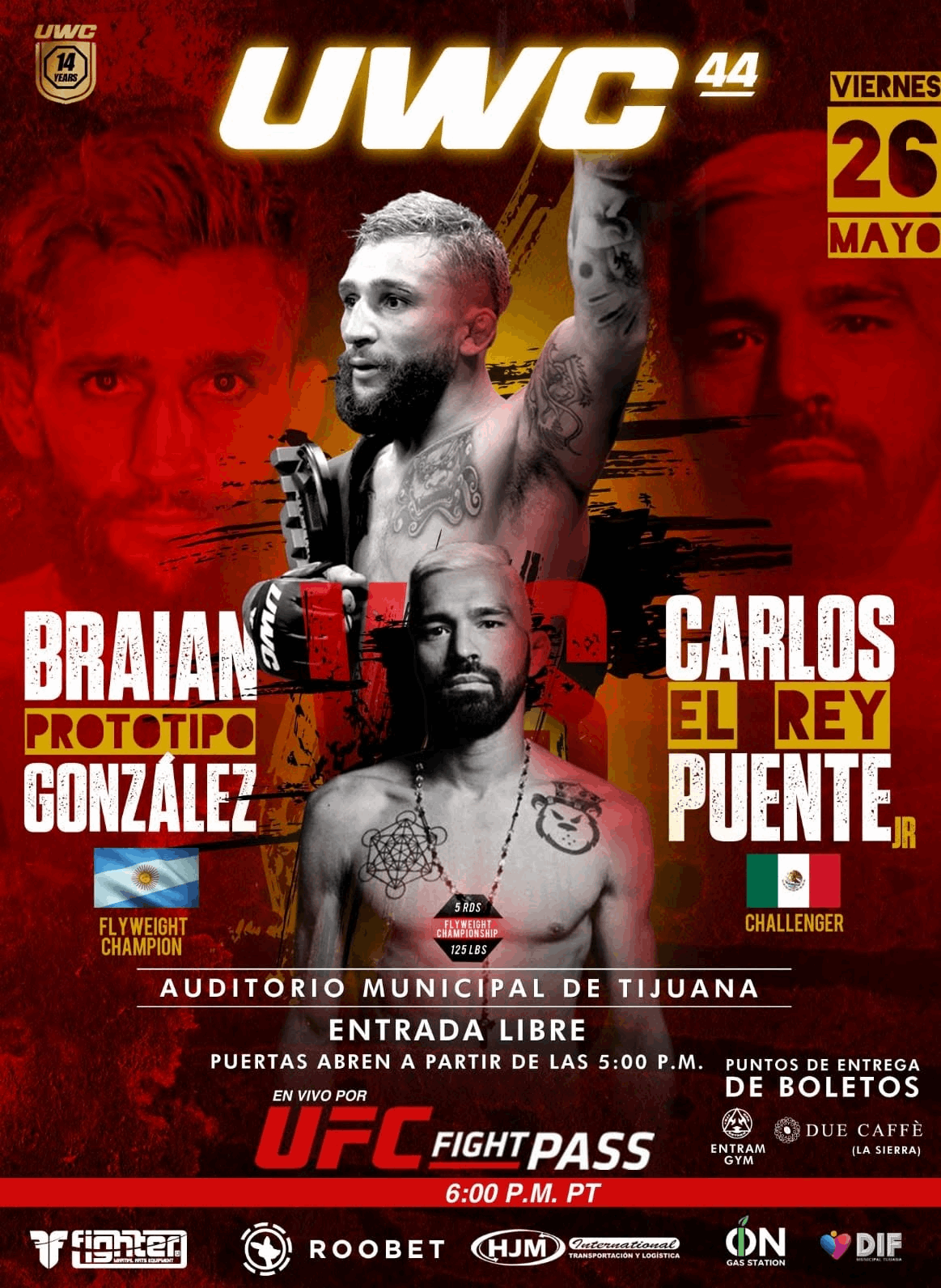 UWC 44 se llevará a cabo el viernes 26 de mayo en las instalaciones del Auditorio Municipal de Tijuana, Baja California, a transmitirse en vivo por UFC Fight Pass con ocho peleas profesionales a partir de las 18:00 horas.
