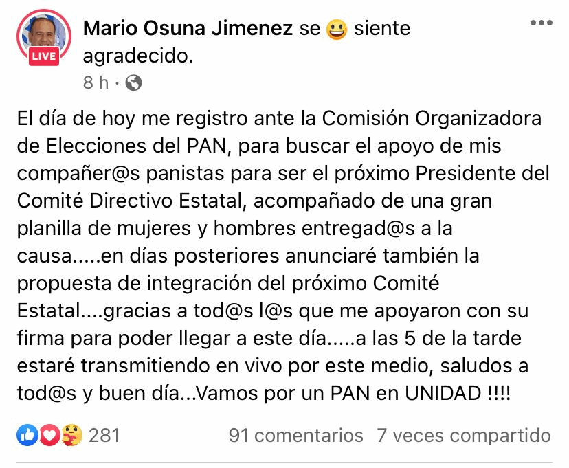 ”Voy a recuperar las raíces que le dieron vida y fuerza a mi partido, sigo de pie como fiel militante del PAN, me respaldan grandes mujeres y hombres comprometidos, de palabra y con amplia trayectoria”, afirmó Osuna.