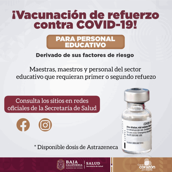 Segundo Refuerzo EXCLUSIVAMENTE para: Personal Educativo y personal de primera línea de atención: Trabajadores de Salud, Policías y Bomberos.