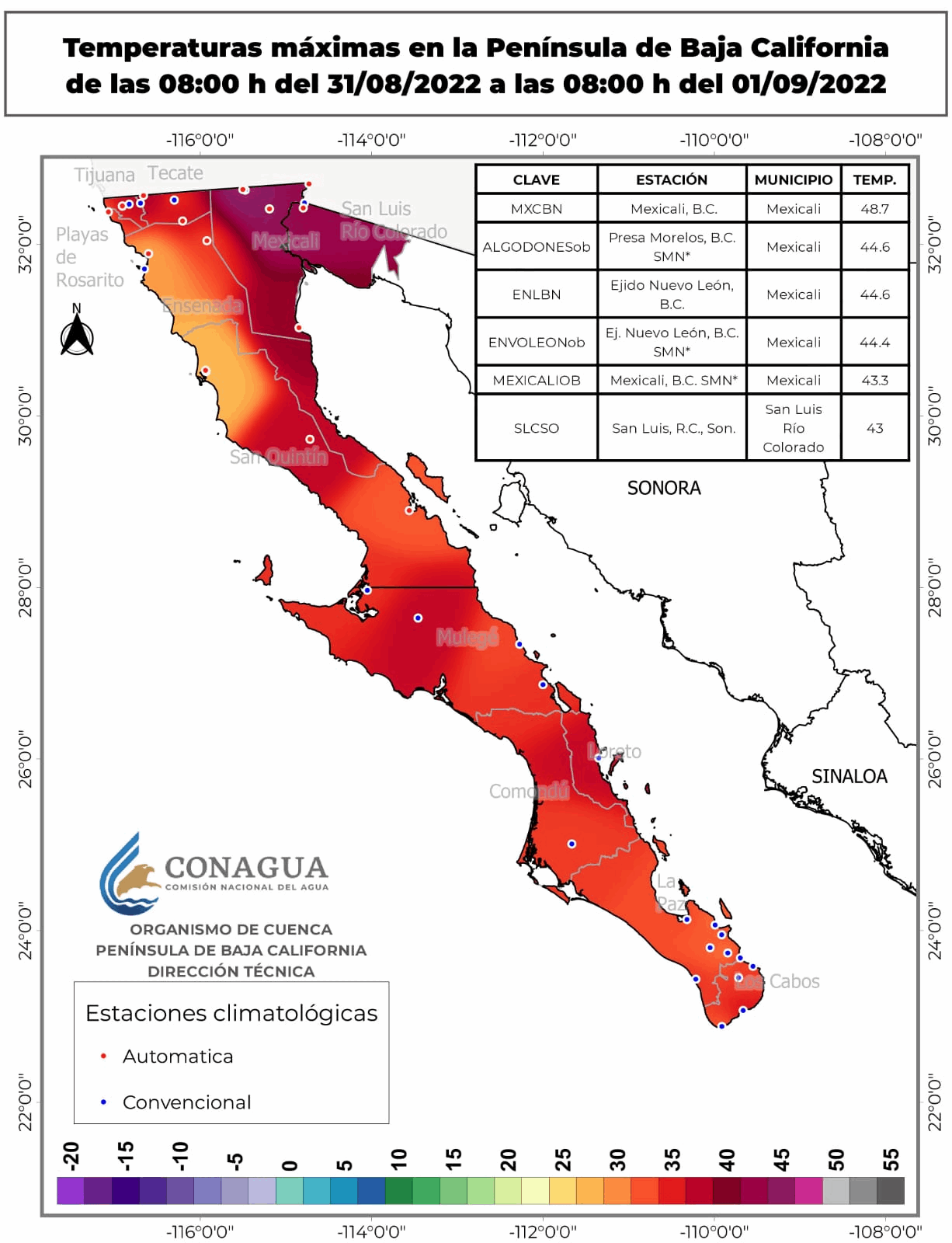 Temperaturas Máximas: 48.7 °C registrada en Mexicali, B.C. y 44.6 °C registrada en Presa Morelos, B.C. SMN*