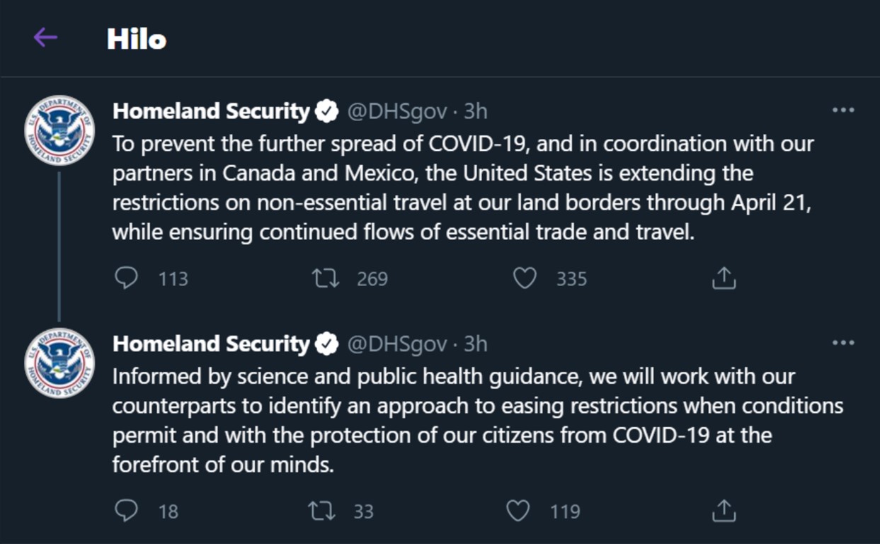 "Para evitar una mayor propagación de COVID-19, y en coordinación con nuestros socios en Canadá y México, Estados Unidos está extendiendo las restricciones a los viajes no esenciales en nuestras fronteras terrestres hasta el 21 de abril, al tiempo que garantiza los flujos continuos de comercio y viajes esenciales. .”