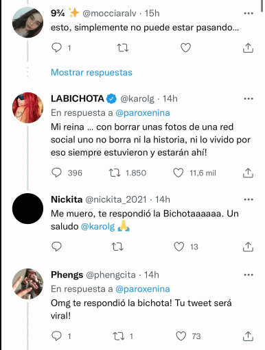 Una fiel seguidora de Carolina Giraldo Navarro, nombre de pila de Karol G, comentó a través de su perfil @paroxenina, en la plataforma de Twitter, que estaba atónita debido a que su mayor modelo a seguir había desbloqueado algunas instantáneas que publicó cuando aún tenía su melena de diamante, color azul. Expuso ante el público digital que las fotos nunca se borraron sino que estaban archivadas.