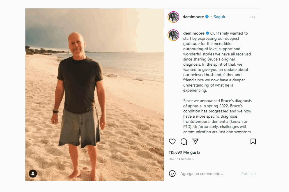 “La condición de Bruce ha progresado y ahora tenemos un diagnóstico más específico: demencia frontotemporal (conocida como FTD). Desafortunadamente, los desafíos con la comunicación son sólo uno de los síntomas de la enfermedad que enfrenta Bruce”, se lee y remarca que “si bien esto es doloroso, es un alivio tener finalmente un diagnóstico claro”.
