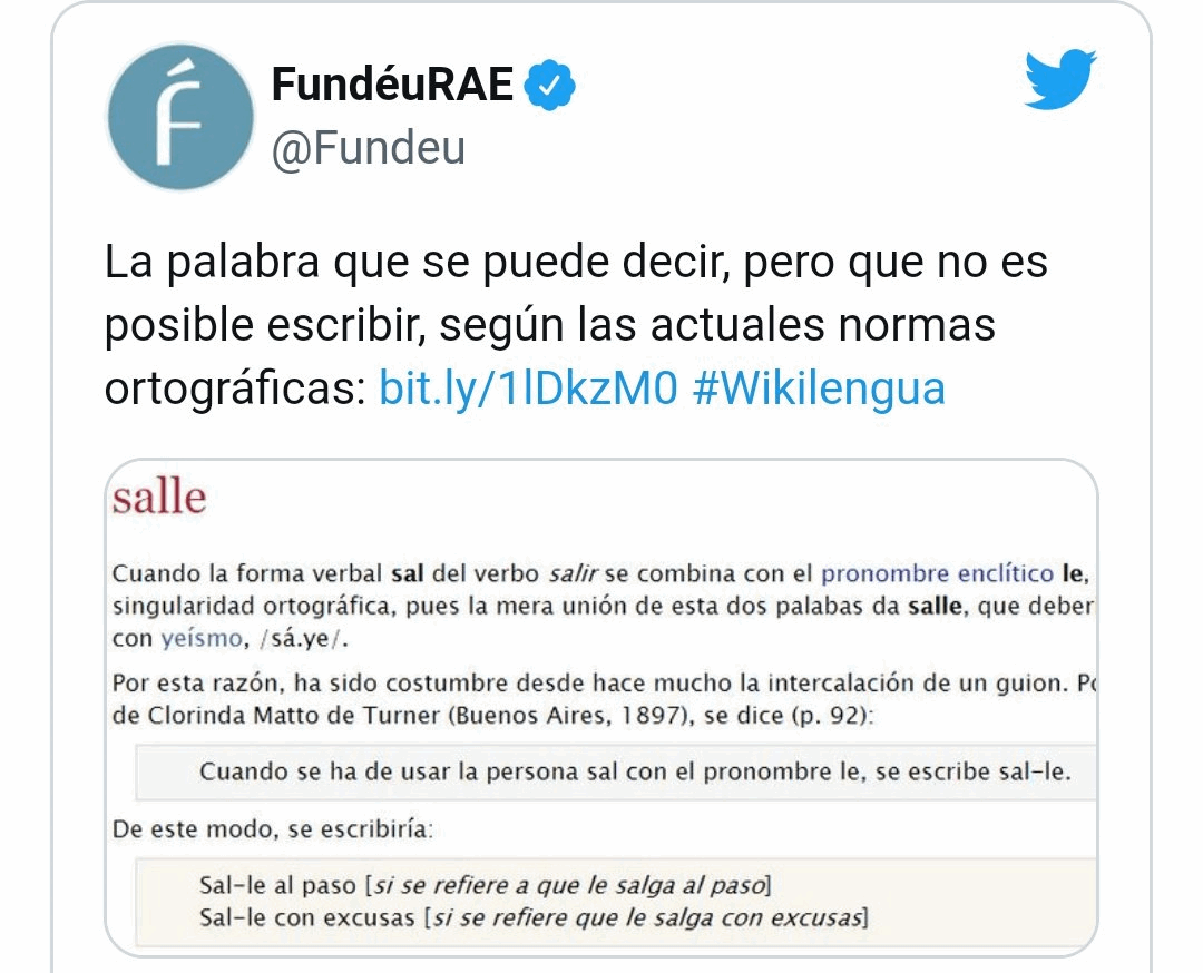 Por ello, según las normas gramaticales actuales, la palabra sa-le debe escribirse con el guión. De acuerdo con un texto que secunda esta postura de EFE y Fundéu, Wikilengua del español, “salle” (pronucniado como sal-le) es una palabra que no se puede escribir: