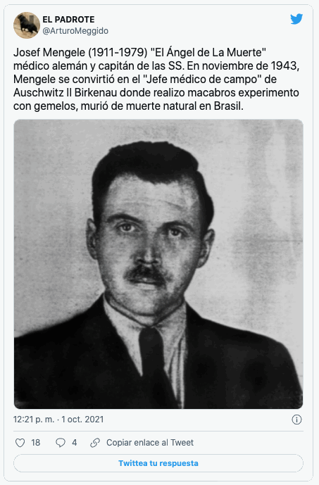 Este doctor era apodado ‘El Ángel de la Muerte’ ya que realizó diferentes experimentos en judíos, la mayor parte de estos se concentraron en gemelos, enanos y procesos de esterilización. Trató de convertir a unos gemelos en siameses pero murieron después de algunos agonizantes días. También trató de arrancar tatuajes del cuerpo o encoger cabezas convirtiendo los campos de concentración en su parque de diversiones.