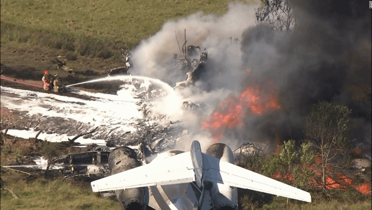 Imágenes de televisión mostraban a los bomberos rociando agua sobre los restos en llamas del avión, que había atravesado una cerca y se había detenido en una pista en un campo, rodeado de árboles y arbustos.