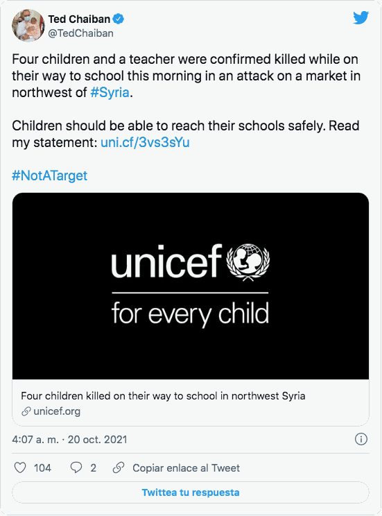 La agencia humanitaria de las Naciones Unidas detalló que los chicos se dirigían a la escuela este miércoles cuando el ataque los alcanzó. “La violencia de hoy es otro recordatorio de que la guerra en Siria no ha llegado a su fin. Los civiles, entre ellos muchos niños, siguen soportando la peor parte de un brutal conflicto de una década”, manifestaron en un comunicado.