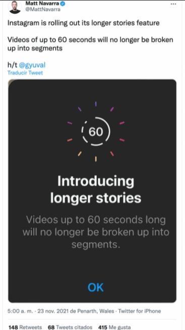 Según el consultor de redes sociales Matt Navarra, el límite de los 15 segundos de video en las Historias de Instagram ha llegado a su fin y ahora el tiempo máximo de duración será de 60 segundos. Es importante añadir que este tiempo límite ya se encontraba disponible en los llamados Reels, pero ahora la opción entrará en las historias.