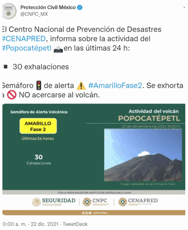 Asimismo, informó que el semáforo de alerta se encuentra en Amarillo Fase 2, por lo que se exhortó a la población a no acercarse al volcán.