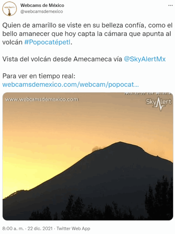 Por otra parte, la cuenta Webcams de México compartió en Twitter una fotografía de “Don Goyo” esta mañana acompañada de la frase: “Quien de amarillo se viste en su belleza confía, como el bello amanecer que hoy capta la cámara que apunta al volcán #Popocatépetl.”