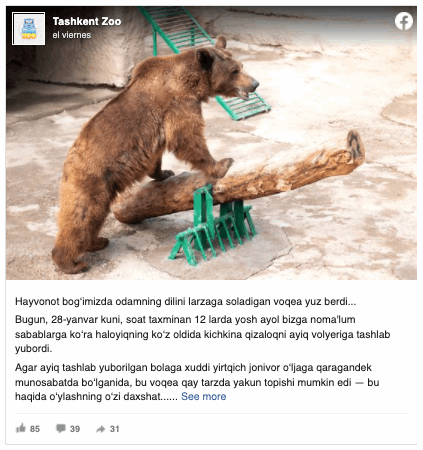 “Nuestro oso Zuzu bajó silenciosamente a la zanja, olfateó a la niña y se alejó. Los cuidadores se movieron rápidamente y comenzaron a llamar al oso a la habitación, y el oso entró a la habitación sin resistencia”, escribieron en su cuenta de Facebook.
