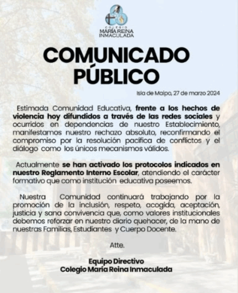 "Estimada Comunidad Educativa, frente a los hechos de violencia hoy difundidos a través de las redes sociales y ocurridos en dependencias de nuestro Establecimiento, manifestamos nuestro rechazo absoluto, reconfirmando el compromiso por la resolución pacífica de conflictos y el diálogo como los únicos mecanismos válidos.