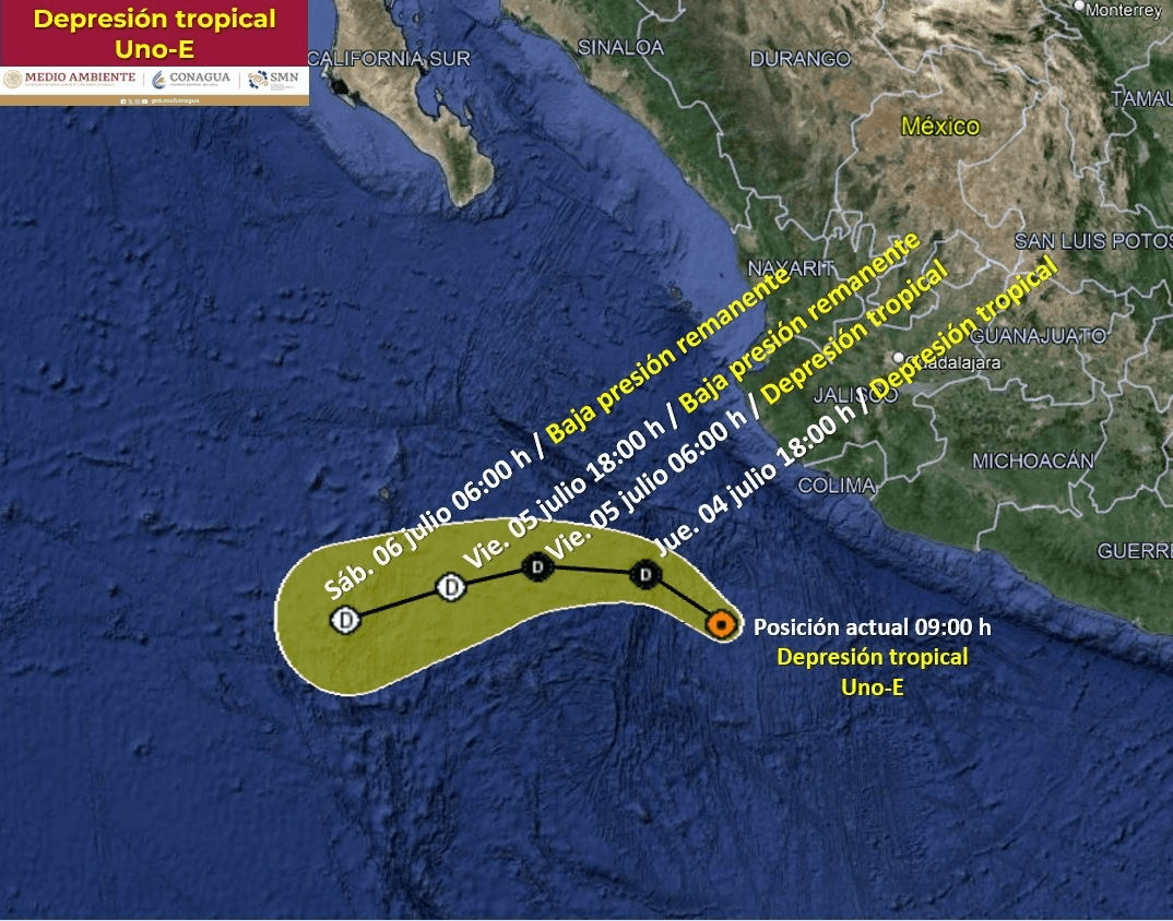 Una depresión tropical se formó la mañana de hoy 4 de julio en el Océano Pacífico, frente a las costas de Colima y Jalisco, a las 9:00 horas, informó la Comisión Nacional del Agua (Conagua); conoce aquí su trayectoria EN VIVO.