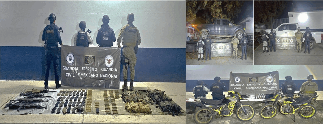 -Personal del Ejército Mexicano al realizar reconocimientos de vigilancia sobre la calzada Heroico Colegio Militar aseguró tres fusiles calibre 7.62 milímetros, de fabricación china, nueve cargadores, 225 cartuchos, tres chalecos tácticos, 23 estrellas ponchallantas y un vehículo.