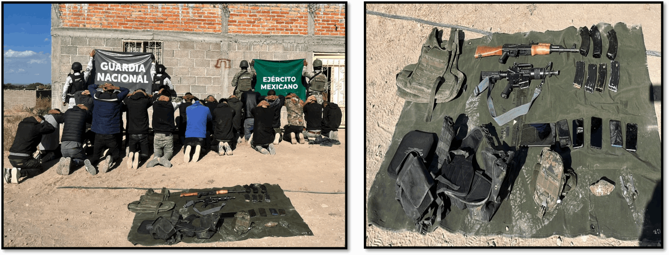 -Elementos de la Defensa y GN realizaron un cateo en el municipio de Ojuelos, donde detuvieron a 21 hombres, aseguraron dos armas largas, siete cargadores, 148 cartuchos útiles, dosis de marihuana y dos chalecos tácticos.