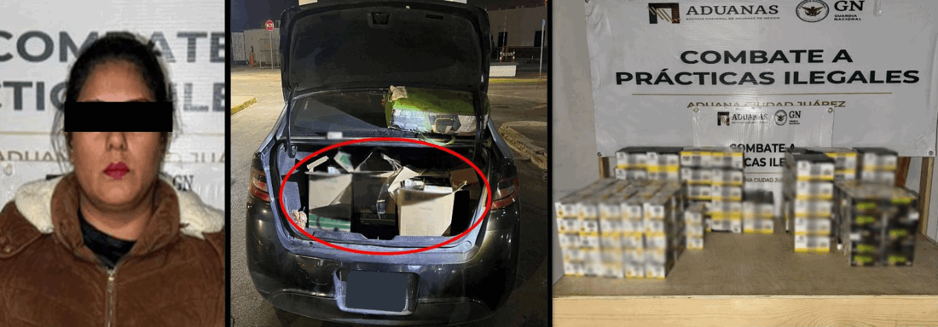 -En Ciudad Juárez, elementos de la GN y Aduanas, al realizar una inspección de seguridad a un vehículo procedente de El Paso, Texas, detuvieron a una mujer que transportaba ocultos 10 mil 100 cartuchos útiles.