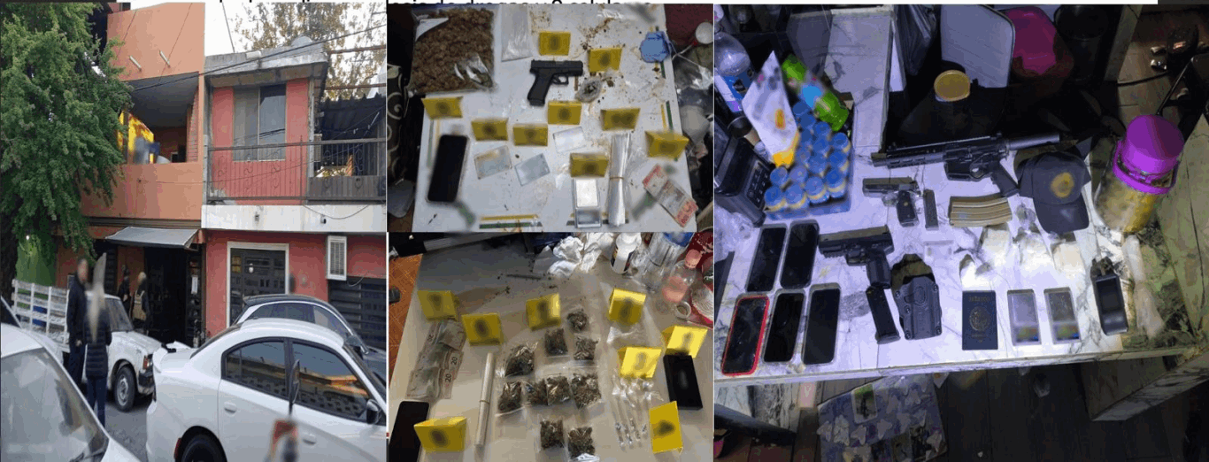 -Elementos del Ejército Mexicano y la Agencia Estatal de Investigación, catearon cuatro inmuebles en el municipio de Apodaca, detuvieron a seis personas y aseguraron tres armas de fuego largas, ocho armas de fuego cortas, 28 cartuchos, diversas dosis de droga y nueve teléfonos celulares.