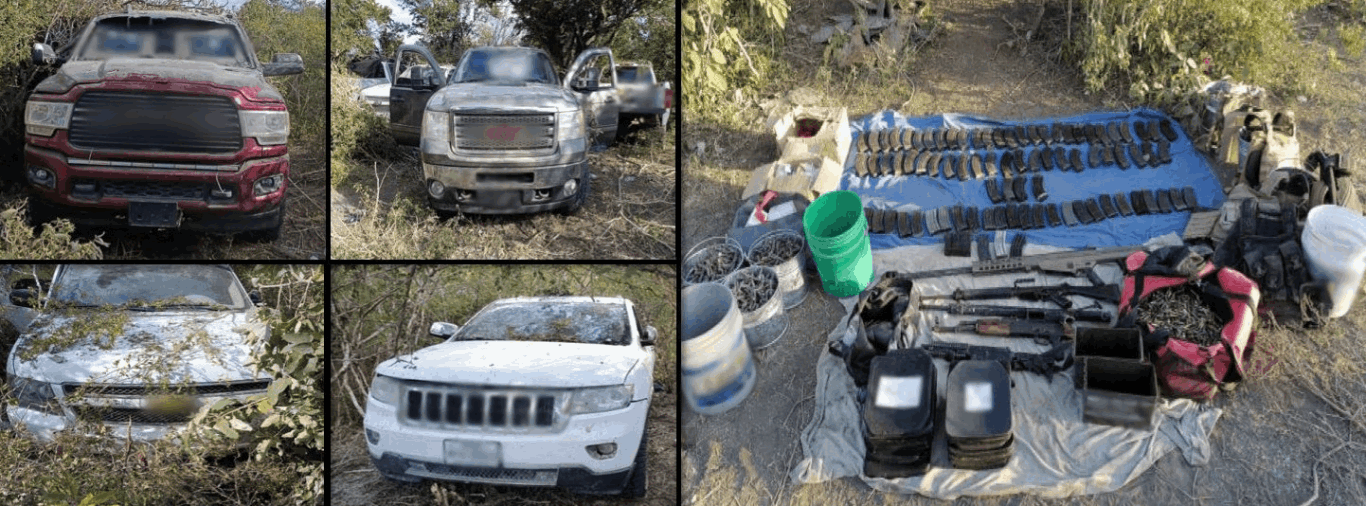 -Personal del Ejército Mexicano, en Ciudad Mante, localizó dos vehículos abandonados, se aseguraron tres armas de fuego largas, nueve cargadores, 170 cartuchos y 4 chalecos tácticos.