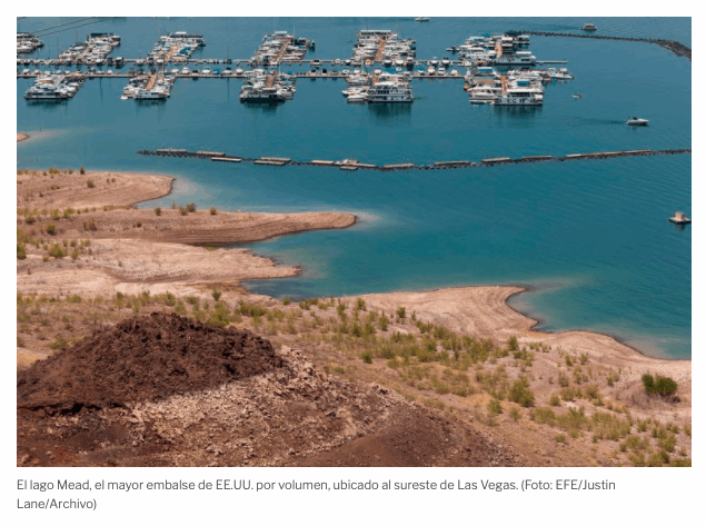 El lago Mead, formado en la década de 1930 a partir de la represa del río Colorado en la frontera entre Nevada y Arizona, es el embalse más grande de Estados Unidos. Es fundamental para el suministro de agua de 25 millones de personas en las ciudades de Los Ángeles, San Diego, Phoenix, Tucson y Las Vegas.