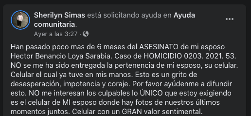 Luego continúa: “El motivo de mi mensaje es porque ya han pasado 6 meses. No hay seguimiento al caso y la verdad no me interesa la “justicia” ni ningún culpable. Solo estoy exigiendo se me entregue el celular de mi esposo. Son su pertenencia. Que dejen de tratarlo como un culpable cuando fue un HOMICIDIO y mi esposo ya no está. Ese celular tiene un gran valor sentimental. Ya es más de medio año y no me importa si le dan carpetazo al asunto sólo quiero su celular donde están nuestras últimas fotos momentos antes del irse por tacos. Este mensaje viene desde mi desesperación, coraje, dolor e impotencia.”