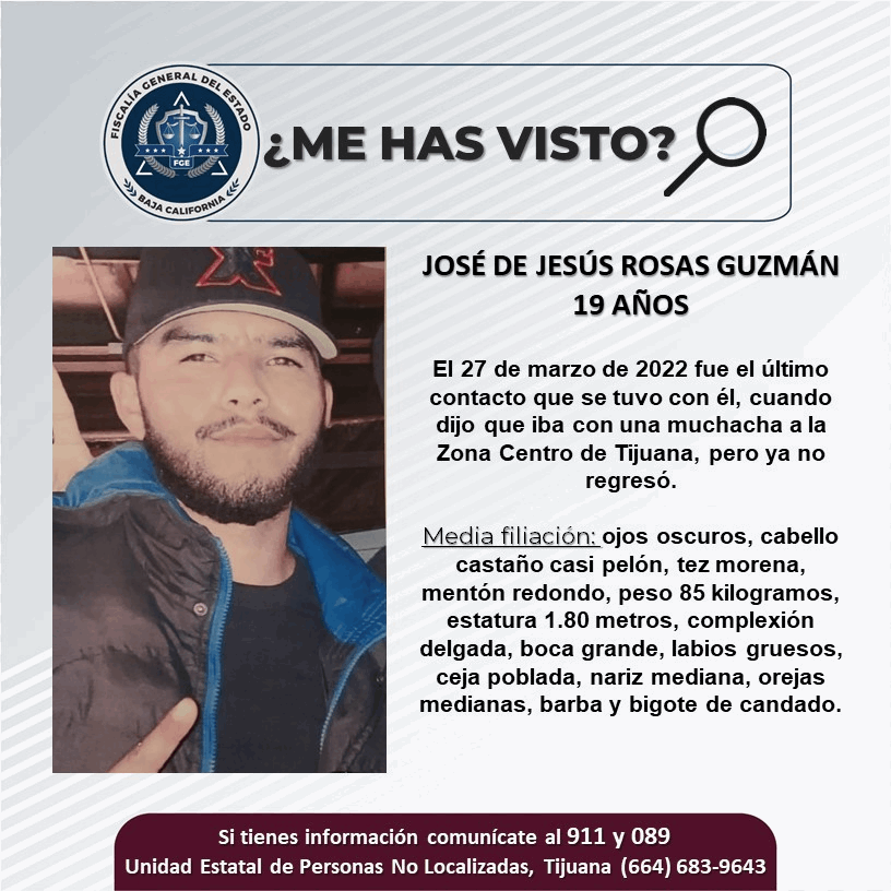 Indica un familiar que el último contacto que se tuvo con José de Jesús Rosas Guzmán, fue el 27 de marzo de 2022, entre las 12:00 y las 13:00 horas, cuando dijo que iba con una muchacha a la Zona Centro de Tijuana, pero ya no regresó, desconociéndose desde entonces su paradero.