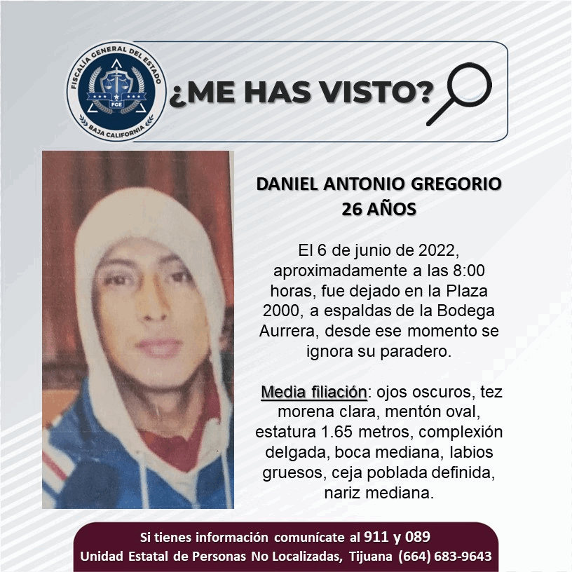 TIJUANA.- La Fiscalía General del Estado (FGE), solicita el apoyo de la ciudadanía para localizar a Daniel Antonio Gregorio de 26 años de edad.