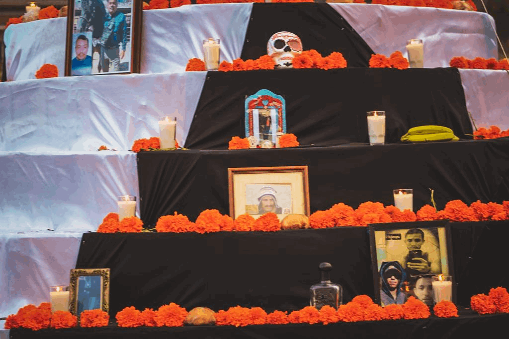 El altar que cuenta con siete niveles, está decorado con los objetos tradicionales, entre ellos flores de cempasúchil y veladoras, además de las fotos de algunos familiares de vecinos del lugar.