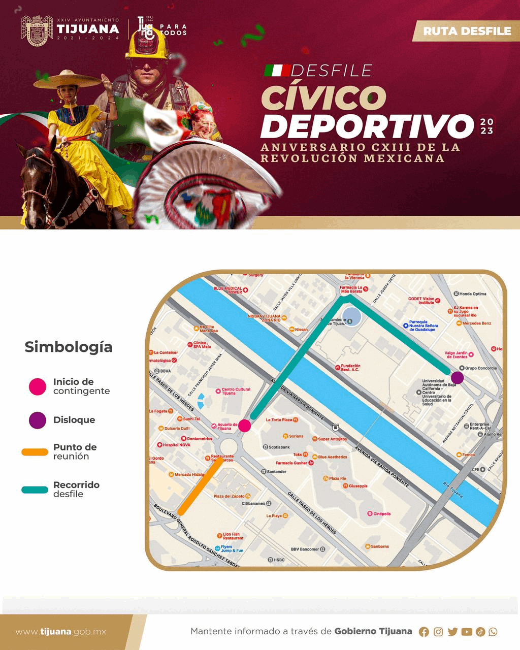 El punto de reunión de los distintos contingentes participantes en el desfile el próximo lunes 20 de noviembre, será sobre bulevar Independencia, entre Rodolfo Sánchez Taboada y Paseo de los Héroes, para posteriormente partir del monumento México continuando por el bulevar Independencia y doblar por la avenida Paseo del Centenario frente a Palacio Municipal, y seguir para concluir frente al edificio de la UABC.