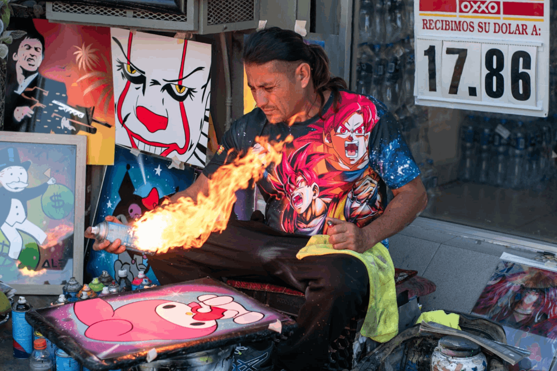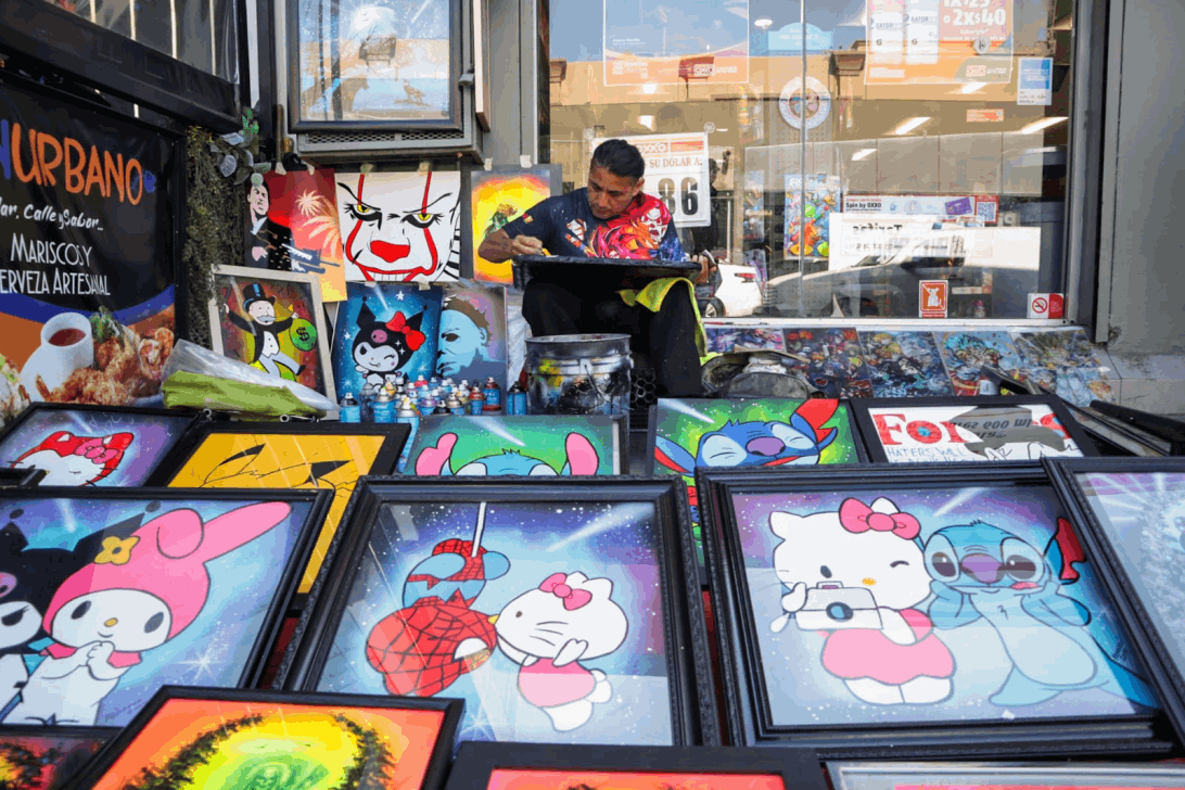 Javier Penacos es un artesano originario de Chiapas que se dedica a la aerosolgrafía y vende sus pinturas en la avenida Revolución de Zona Centro